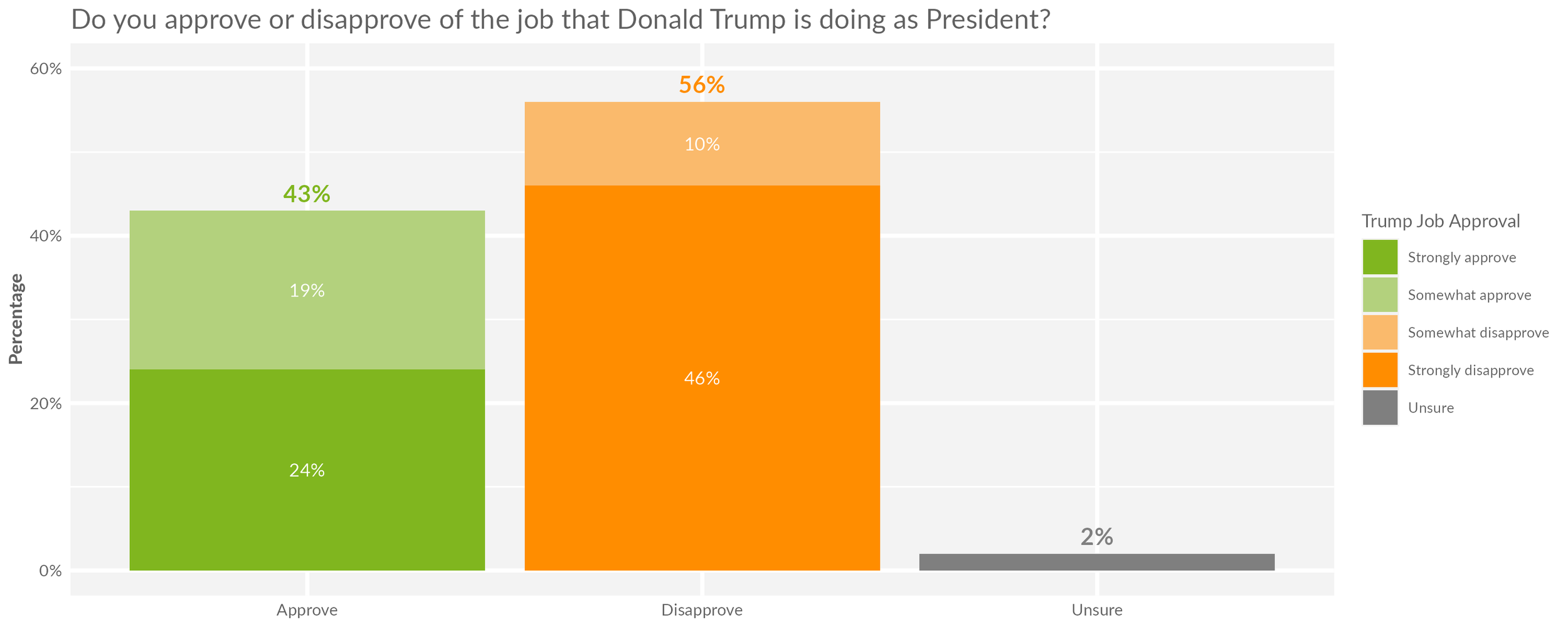 Trump’s approval rating has continued to decline, falling to a new low of his second term. 56% of voters disapprove of Trump’s job performance, while only 43% approve, representing a 2 point decline in net approval rating since December. More voters strongly disapprove (46%) than overall approve (43%) of the job Trump is doing as president.