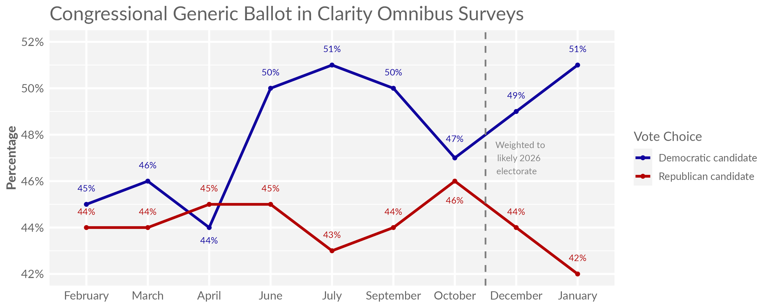 In the first Clarity Omnibus survey of the midterm year, Democrats hold a 9 point advantage over Republicans on the Congressional generic ballot. 51% of likely midterm voters say they will support a Democratic candidate for Congress, tying the highest vote share for Democrats on the generic ballot since the start of Trump’s second term. Only 42% of likely midterm voters indicated support for a Republican candidate, marking the lowest vote share for Republicans on the generic ballot in the same time period. This also represents a net gain of 4 points on margin for Democrats since December.