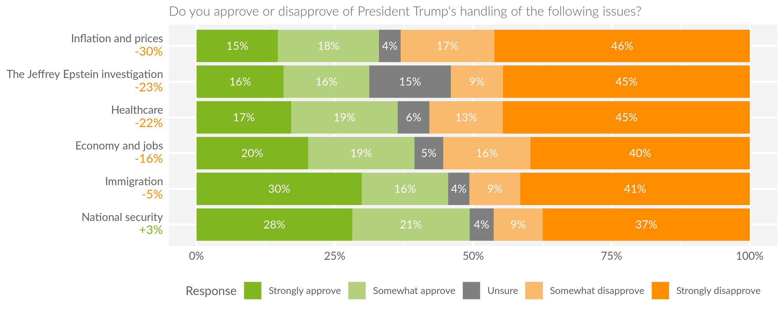 Breaking out the President’s approval by issue, we see more intense dissatisfaction with the handling of certain issues. President Trump’s net approval rating for his handling of “Inflation and prices” has fallen to a second term low of -30%, including a -62% net approval rating among Independents. Voters also continue to disapprove of the President’s handling of the Jeffrey Epstein investigation, where he holds a -23% net approval rating.