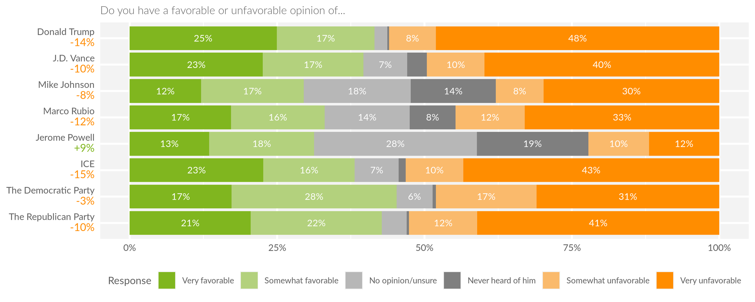 In this month’s Omnibus survey, we asked voters to rate the favorability of several political figures and institutions. Among all people/organizations tested, ICE carried the lowest net favorability of -15%, followed closely by Donald Trump at -14%. Note that this survey was fielded after the killing of Renee Good and before the killing of Alex Pretti.