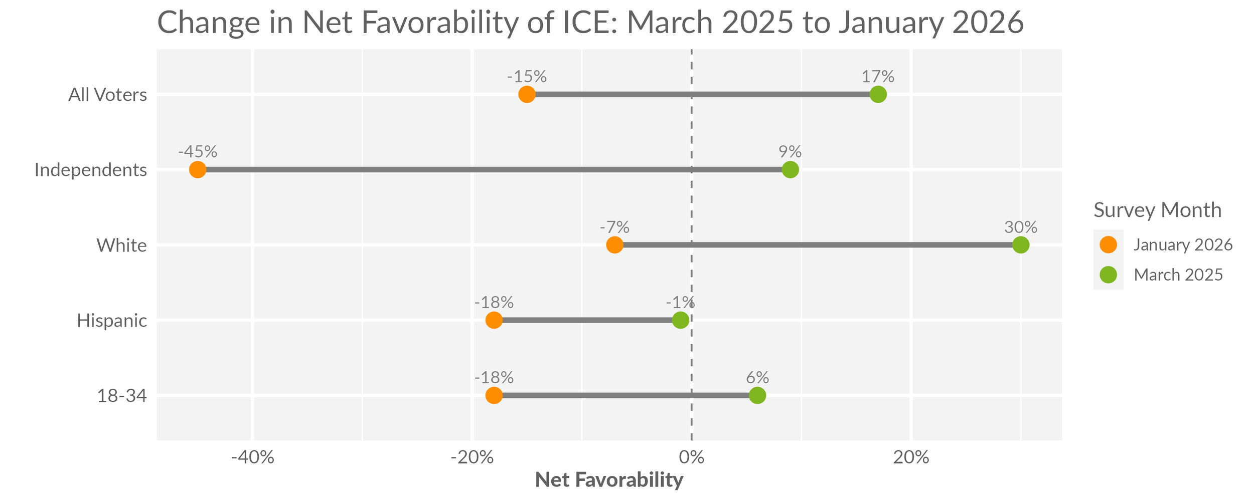 This represents a dramatic about-face in the favorability rating of ICE among voters. In the March 2025 Omnibus survey, voters held a net favorable view of ICE by 17 points, which corresponds to a 32 point decline in net favorability for ICE. This decline in net favorability can be seen across all voters, but with particularly large drops among certain subgroups, such as a decline of 54 points among Independent voters.