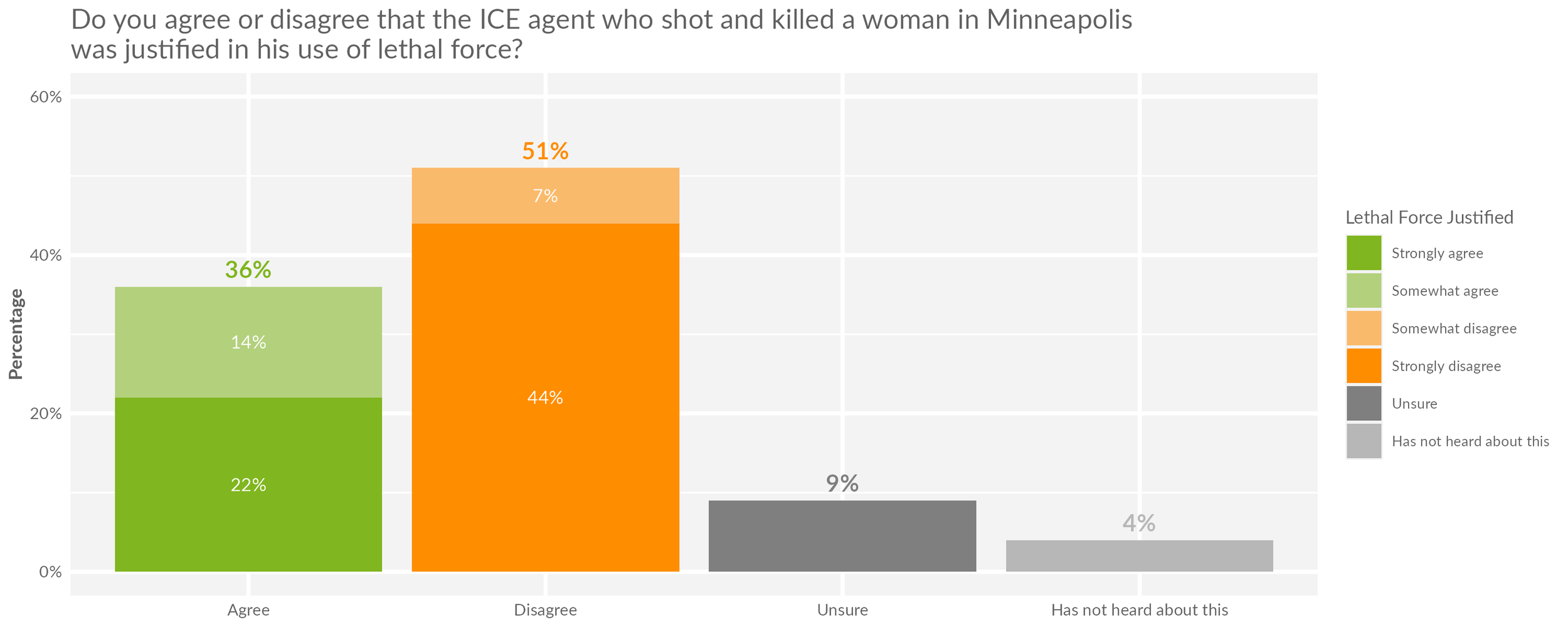 We also asked voters about the killing of Renee Good at the hands of ICE agents in Minneapolis. When asked if they agreed or disagreed that the ICE agent’s use of lethal force against Renee Good was justified, 51% of respondents disagreed, including 44% who strongly disagreed, to only 36% who agreed. News of this event has broken through among a wide swathe of likely midterm voters, with only 4% of voters indicating they had not heard of the shooting.