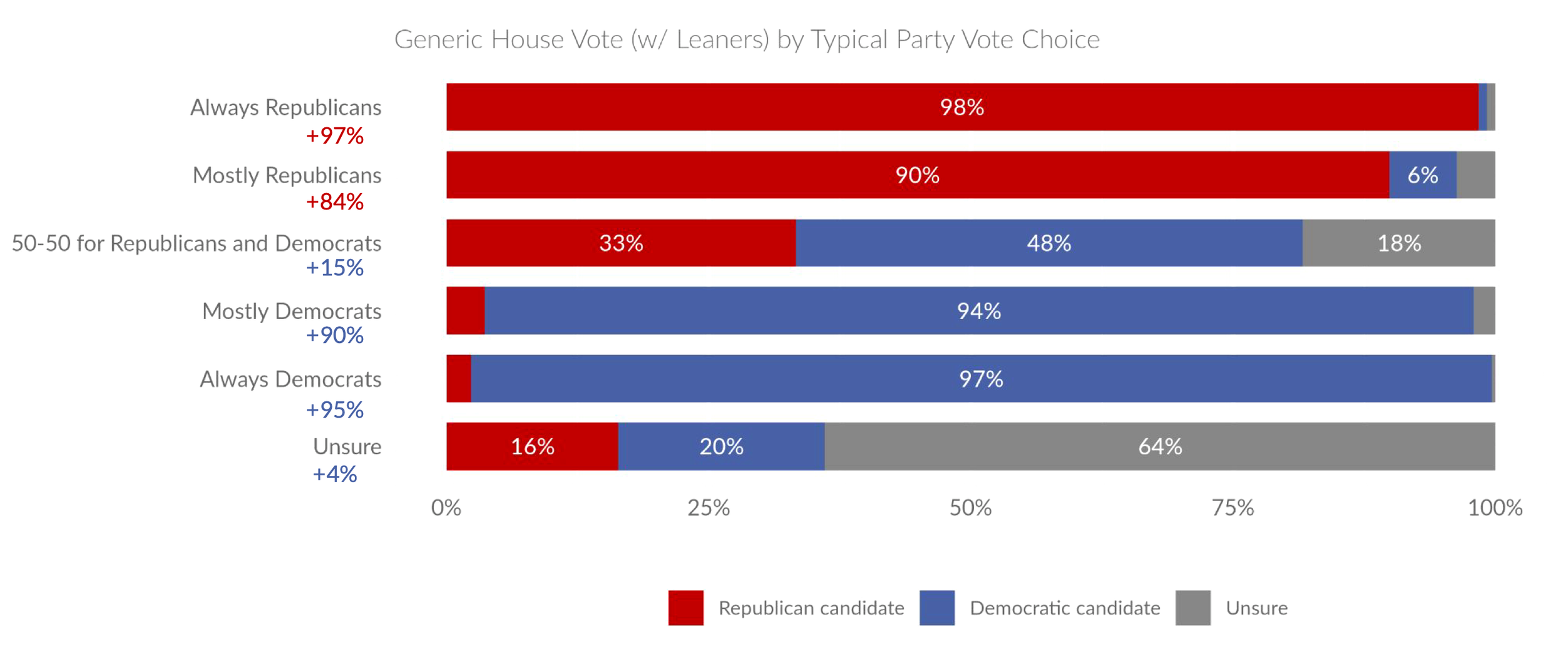 This month, we polled likely midterm voters on their typical party preference in elections, asking whether they typically support one party or if their vote choice varies. Looking at Congressional generic ballot performance across the resulting subgroups, we can see that Democrats have consolidated their likely midterm voters more than Republicans. Democrats have a larger margin of support among voters who always or mostly support Democrats than Republicans do among voters who always or mostly support Republicans. Moreover, among self-identified “swing voters” who vote for both parties, Democrats hold a 15 point lead on the generic ballot.