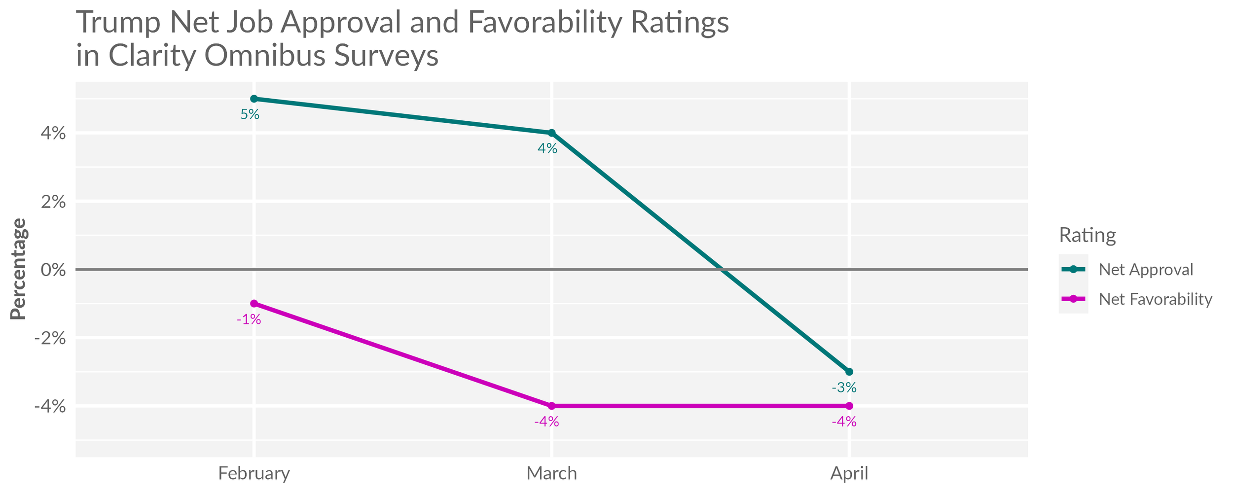 In the aftermath of his global tariff rollout, President Trump’s approval rating has fallen significantly since our last survey: 46% of voters approve of his job as President, while 49% disapprove. Trump’s net favorability has been underwater since the first Clarity Omnibus of 2025; however, his job approval had remained positive until now.