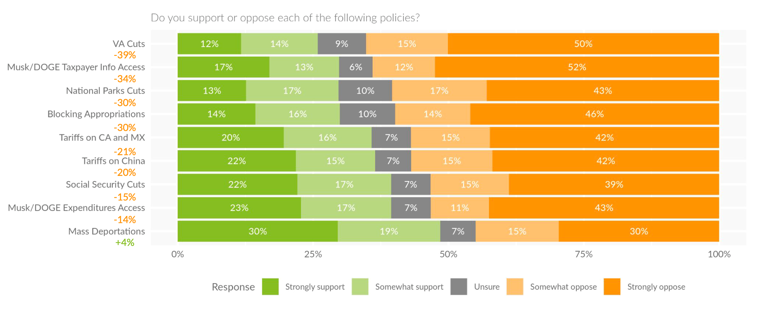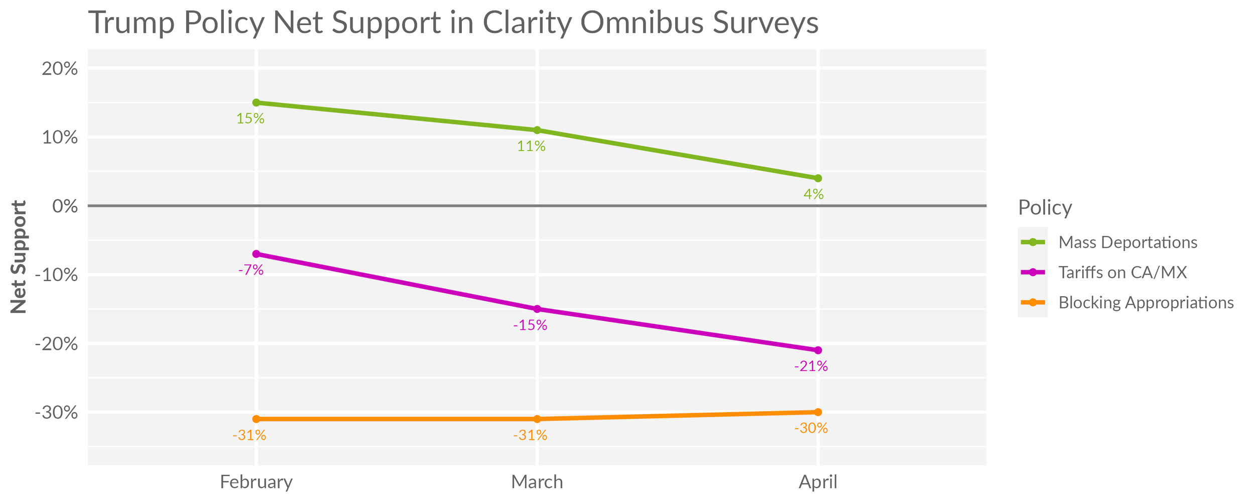 Three of these policies have been polled in each Clarity Omnibus Survey since the start of Trump’s term. Of those three, ‘Mass Deportations’ and ‘Tariffs on Canada/Mexico’ have seen their support slide in each consecutive month as details on the actual policy come to light, while ‘Blocking Appropriations’ has held steady in deeply unpopular territory.