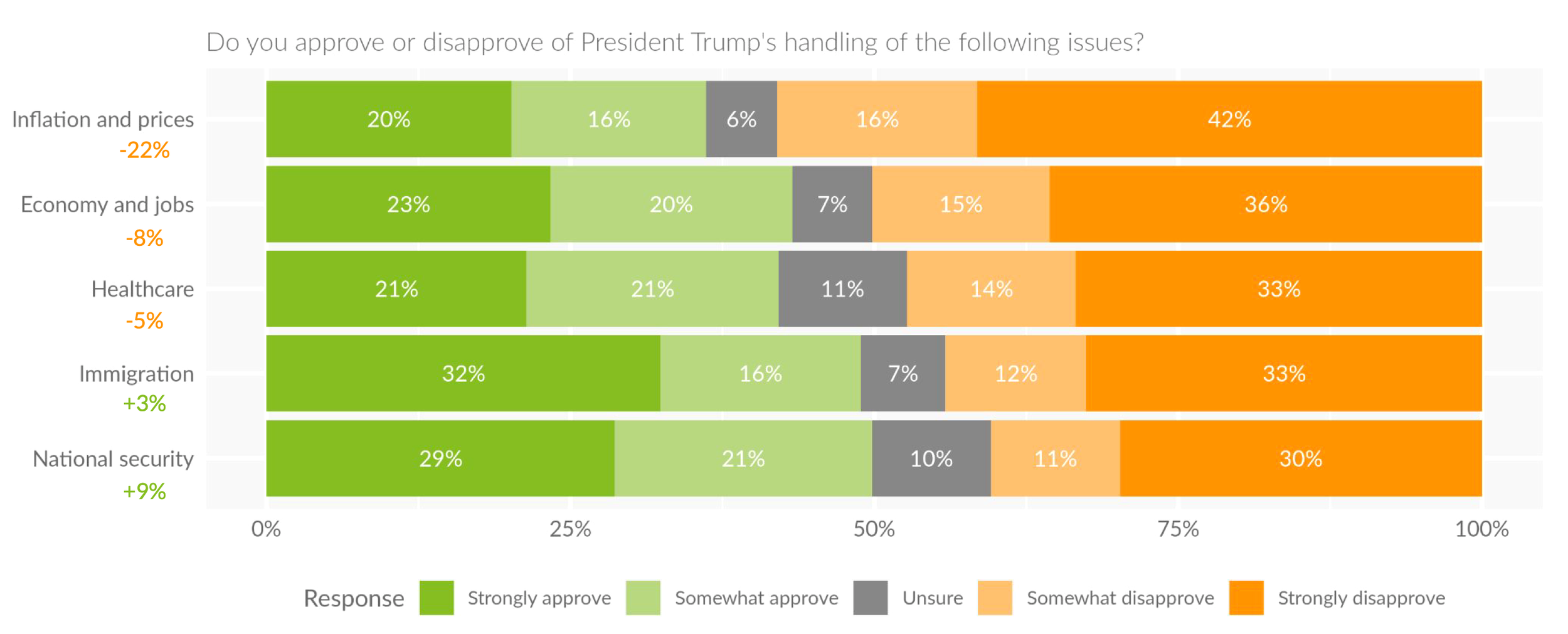 Breaking out President Trump’s job approval by issue, voters largely disapprove of his handling of economic issues. Trump’s negative net approval ratings for his handling of the ‘Economy and Jobs’ (-8%) and particularly ‘Inflation and Prices’ (-22%) contrast with his campaign focus on the cost of groceries. Even among Republicans, 32% disapprove of his handling of ‘Inflation and Prices’. The issue areas where Trump holds positive net approval are ‘Immigration’ (+3%) and ‘National Security’ (+9%).