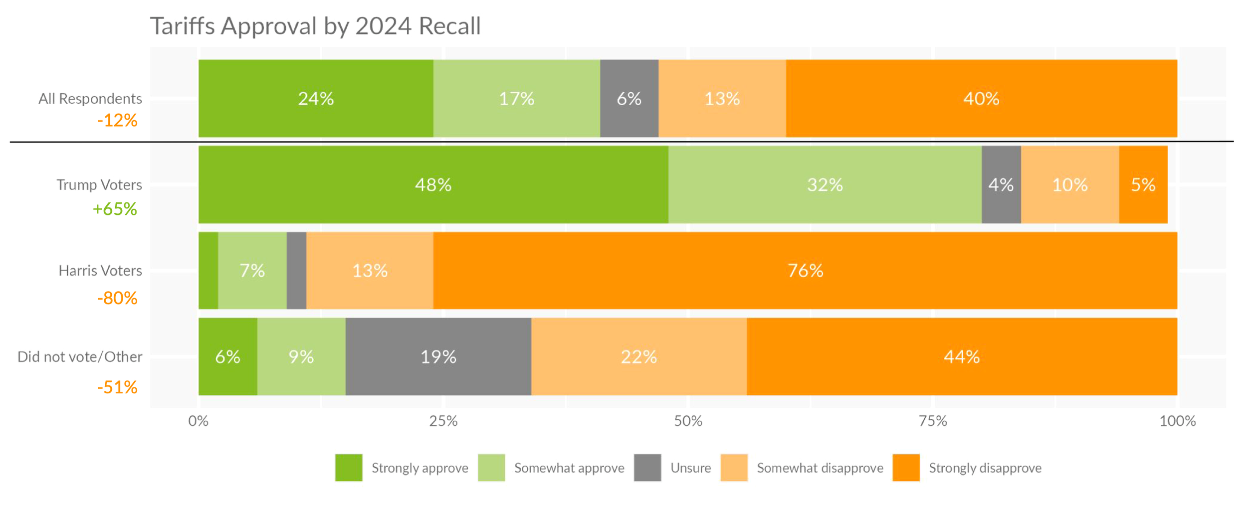 This month’s survey asked if voters approved or disapproved of the new tariffs that President Trump has planned on all products imported from other countries (this survey was fielded entirely after the full tariffs were rescinded). Only 41% of voters approve of the tariffs while 53% disapprove, including 15% of Trump voters who disapprove.