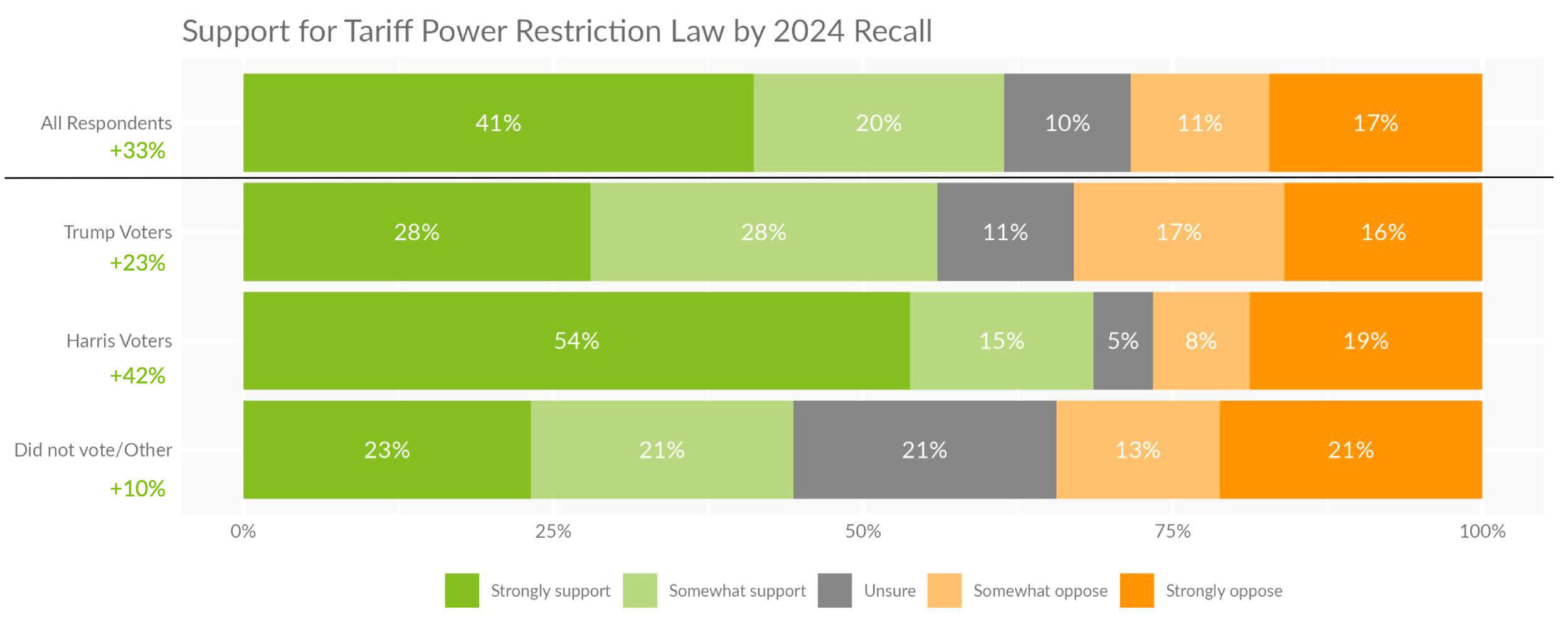 Voters are also strongly in favor of Congress taking action to check Trump’s tariff power. 61% of voters say they would support a law which restricts the president’s ability to impose tariffs without congressional approval, including 56% of Trump voters, versus only 28% who would oppose such a law.