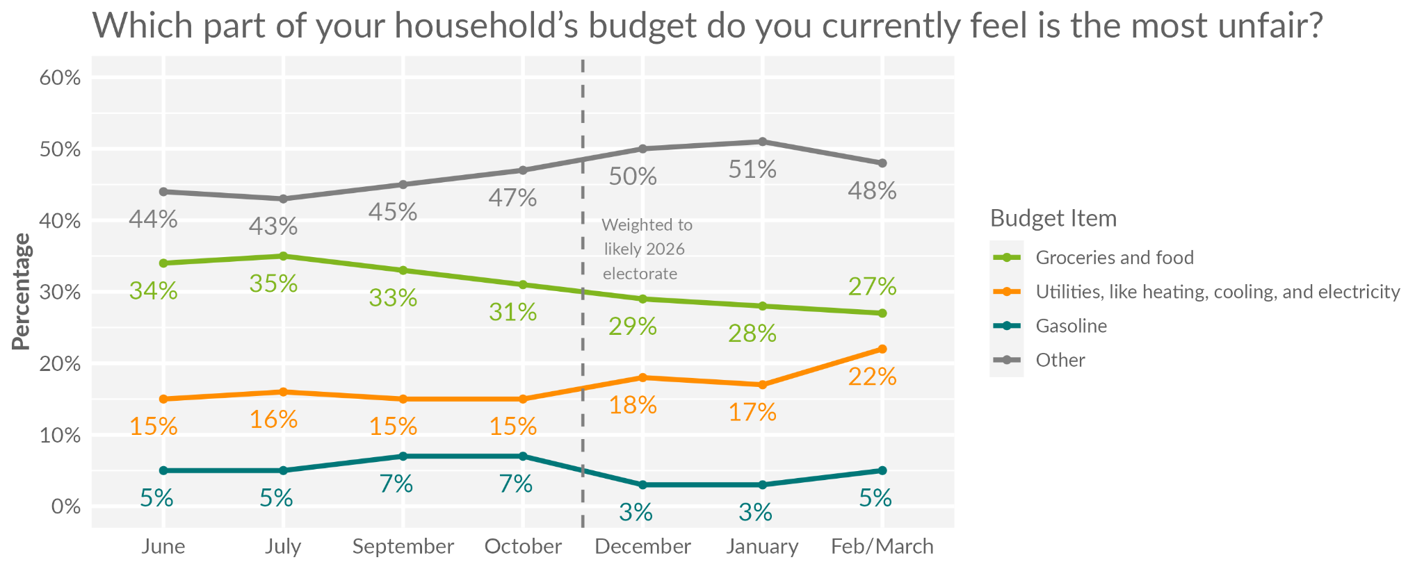 These numbers confirm that midterm voters are likely to be very sensitive to any unexpected increase in prices across their budget, which is a point to consider as we prepare for potential economic fallout from war with Iran. For the past several months of the Clarity Omnibus survey, we have been asking voters what component of their household budget they find the most unfair. After a bitterly cold January for much of the country, the share of voters identifying utility costs as the most unfair component of their budget has been trending upwards, hitting a high of 22% this month. The share of voters reporting gasoline costs as the most unfair, while starting to tick up, is quite low (5%).
