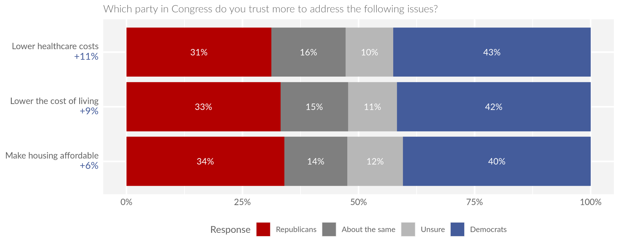 Over the past several months of the Clarity Omnibus surveys, voters have consistently expressed disapproval of Trump’s handling of inflation and prices. This month, the president’s net approval on inflation and prices sits at -24%, his worst approval rating across all issue areas that were tested. President Trump’s unpopularity on this issue has provided Democrats a modest but notable trust advantage on issues related to affordability and prices. This month, we asked voters which party they trusted more to address a variety of affordability-related issues, and a plurality of voters trusted Democrats over Republicans across every issue tested. Democrats hold a trust advantage on lowering healthcare costs (+11%), lowering the cost of living (+9%), and making housing more affordable (+6%).