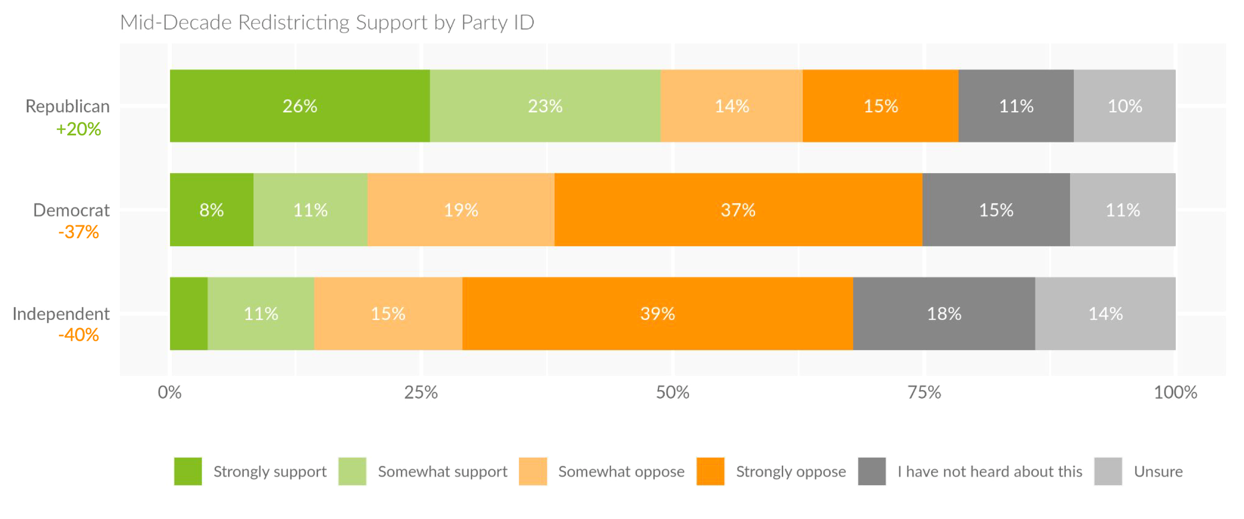 When breaking out support for mid-decade redistricting by party identification, we find that while Republicans support these efforts, other voters staunchly oppose them, with net support for redistricting at -37% and -40% among Democrats and Independents, respectively.