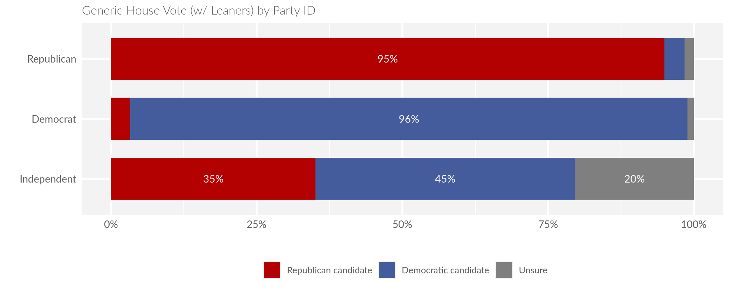 Much of this improvement on the generic ballot for Democrats since the start of the year comes from improved consolidation of Democratic-identifying voters, and a healthy lead among Independent voters. Voters who self-identify as partisans indicate similar levels of support for their own party on the generic ballot, but self-identified Independents prefer a Democratic candidate to a Republican candidate by a margin of 10 points, 45% to 35%.