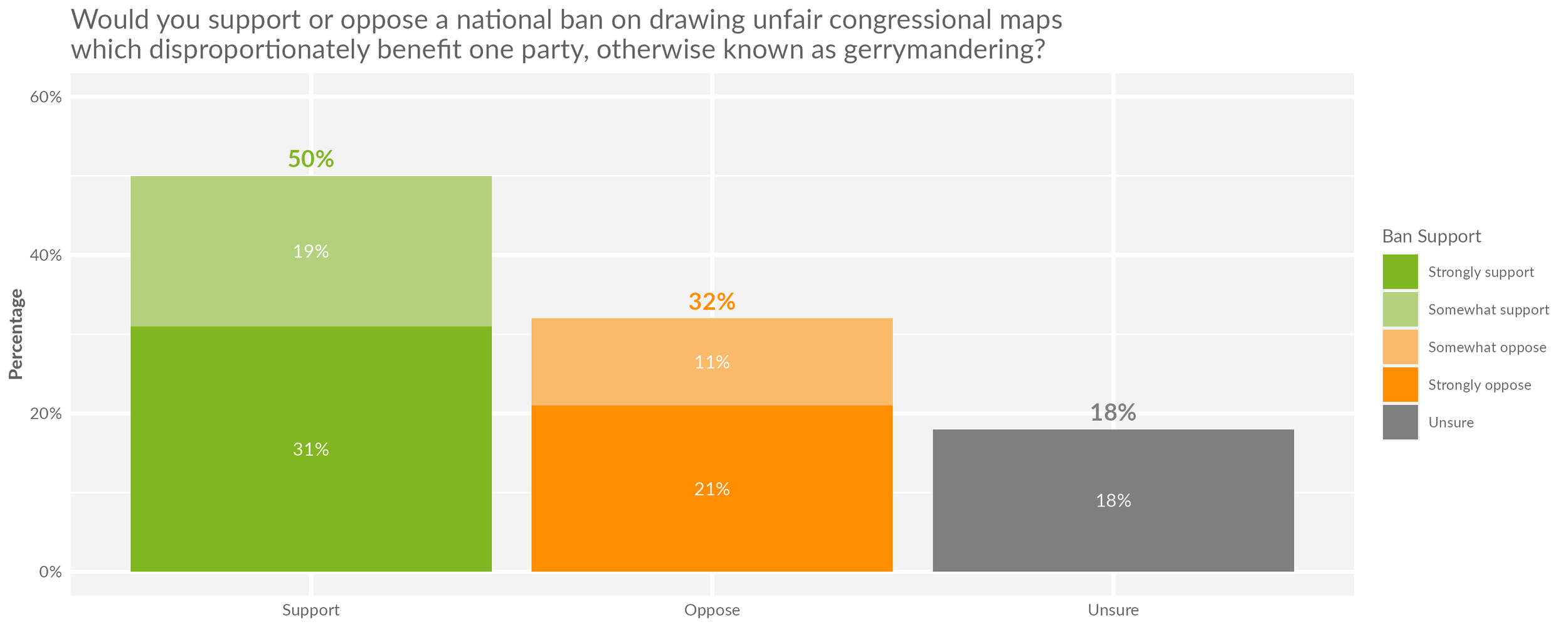 In fact, a majority of voters want Congress to step in and address unfair redistricting practices. 50% of respondents reported support for a national ban on gerrymandering, versus 32% who oppose such a ban.